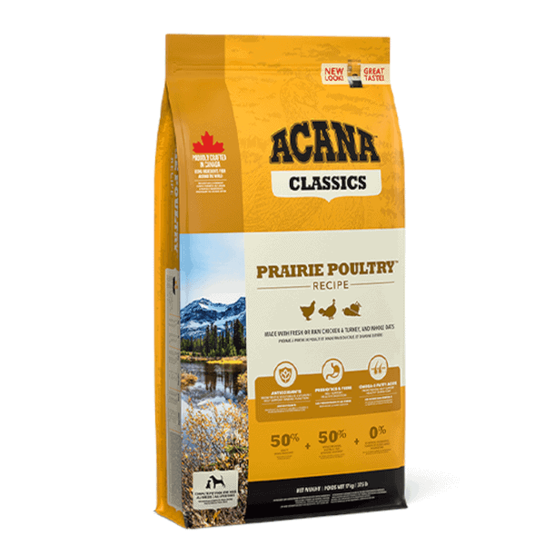 Acana Prairie Poultry features free-run chicken & turkey and cage-free eggs and includes home-grown steel-cut oats that help promote stable blood sugar and peak physical conditioning. Loaded with nourishing meat protein, Acana Prairie Poultry features free-run chicken & turkey and cage-free eggs raised on prairie farms, and delivered to our kitchen fresh or raw in WholePrey ratios.