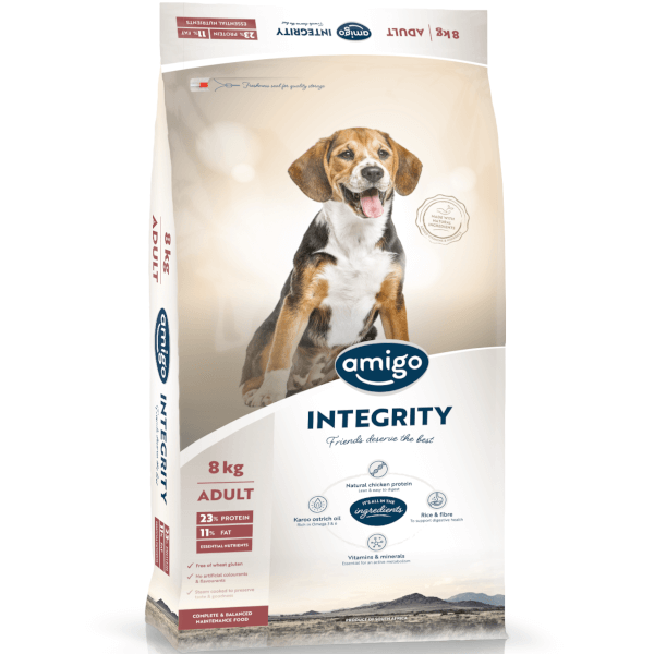 All dogs deserve to eat exceptional nutrition that supports their bones and joints, maintains healthy muscles, promotes good digestion and keeps their skin and fur healthy and shiny. Some dogs have sensitive constitutions and don’t always absorb the nutrients they need because of adverse reactions, which is why Amigo Integrity use the simple, natural approach. The single-source protein from lean chicken, alternative fibre, Karoo ostrich oil for omegas 3 and 6, as well as added vitamins and minerals provide nutrient-dense dog food that supplies enough energy for your dog’s daily needs. You don’t have to worry about added flavourants and colourants, wheat gluten, maize, soya or any sneaky GMOs… because there are none!