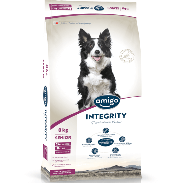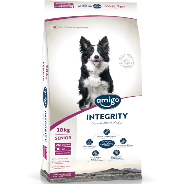 Give your ageing furry amigo a vet recommended bowl of Amigo Integrity Senior dog food to ensure their need for muscle, bone and joint maintenance is met, as well as their need for additional immune support. Produced in a local factory kitchen in Mossel Bay, Amigo dog food is an affordable solution for ideal pet nutrition for mature dogs.