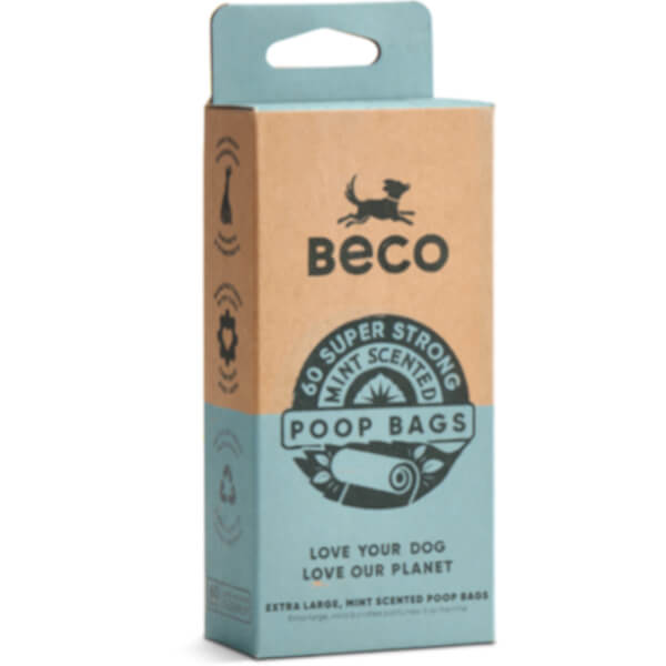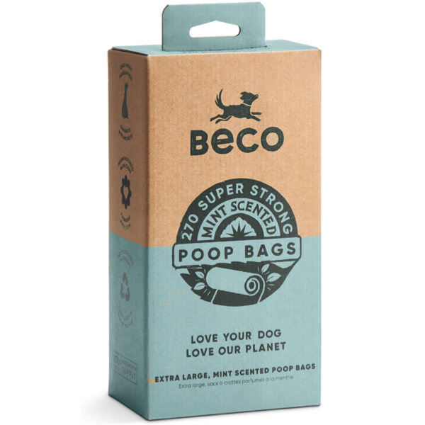 Beco Mint Scented Poop Bags are big, strong and leak-proof. Coming in at 22.5 x 33 cm they are extra long and thick to protect your hands. Made using 100% post-consumer recycled material, every roll of bags comes on a recycled cardboard core, the cardboard packaging is recycled and recyclable. These rolls will fit in all standard bag dispensers and are also available in mint-scented options.