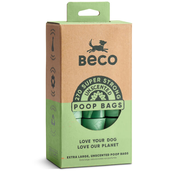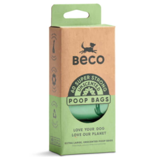 Beco Unscented Poop Bags are big, strong and leak-proof. Coming in at 22.5 x 33 cm they are extra long and thick to protect your hands. Made using 100% post-consumer recycled material, every roll of bags comes on a recycled cardboard core, the cardboard packaging is recycled and recyclable. These rolls will fit in all standard bag dispensers and are also available in mint-scented options.