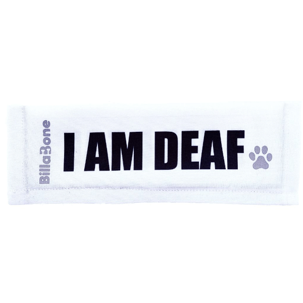 White signals that your dog may not respond to sounds due to hearing impairment, helping others approach with care and understanding.