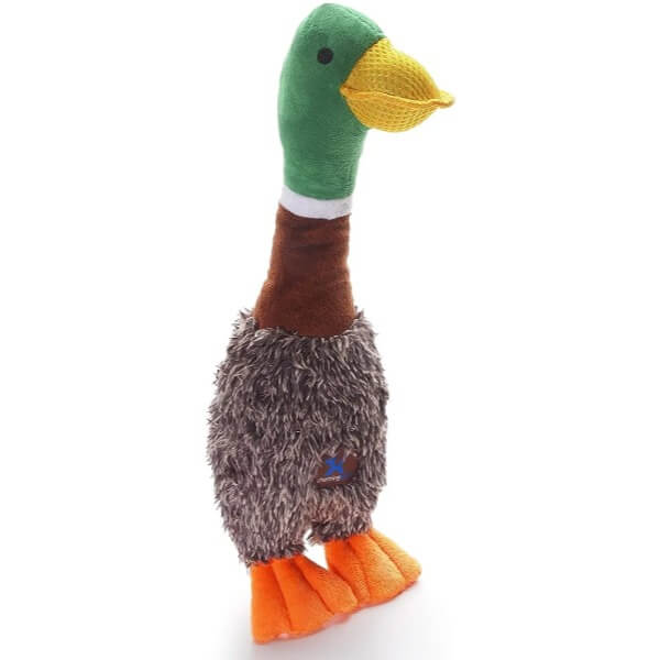 - durable plush dog fetch toy: The Headbangerz Duck from Outward Hound is a fun dog fetch toy that lights up and squeaks to keep your dog excited and engaged.