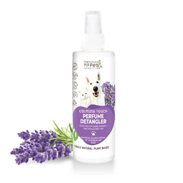 This detangling spray nourishes the skin, softens the fur, gives shine, and makes brushing easier with the fresh botanical fragrance of Lavender and Sage oil. Nourishes dry, sensitive skin while restoring natural moisture. Use between baths to freshen, condition, and detangle, or as a finishing spray after bathing with Pannatural Pets Shampoo. Lavender and Sage Essential Oils help to calm your pet and may be perfect for pets that are anxious or stressed.