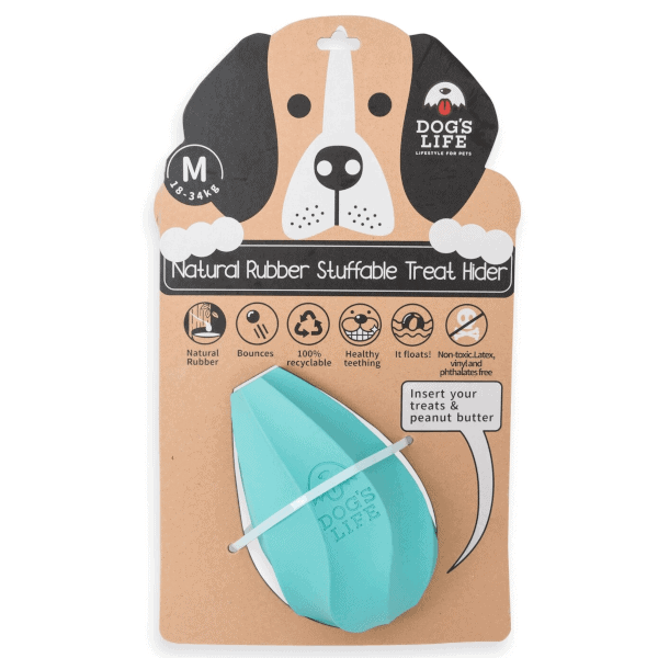 Made from our natural rubber which is durable enough for persistent chewers yet soft and chewy enough to satisfy your dog's chewing impulse. On top of it all, the Stuffable Treat Hider is great for water play since it can be thrown and bounces and floats in the water. Natural rubber is a renewable, sustainable resource. Help protect nature for you and your pup.