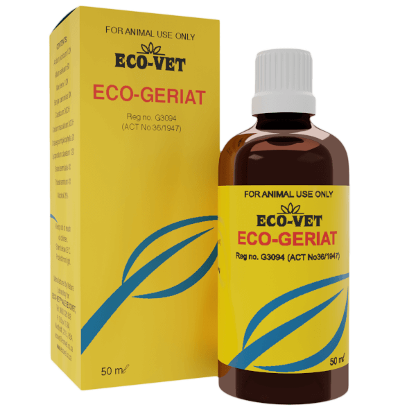 ECO-GERIAT is specifically intended to support the function of the organs and body systems of animals when they start showing signs of aging, anywhere from about 6 years of age. It also helps rejuvenate a depressed immune system and support mobility in elderly animals. Also useful as a post operative tonic to support recovery after operations.