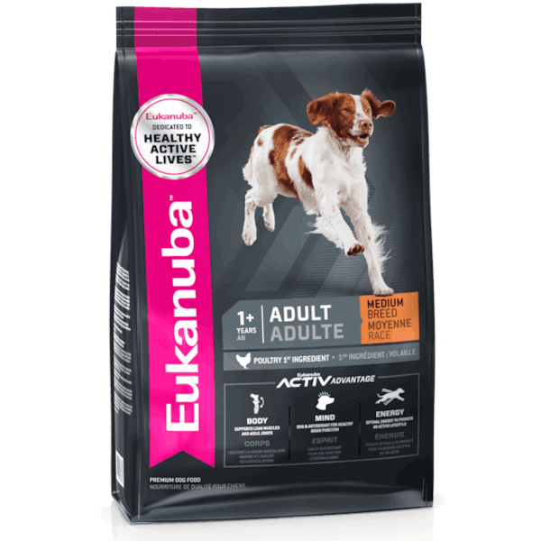 Complete and balanced feed for medium breed adult dogs.Eukanuba™ ADULT MEDIUM BREED Dog Food is formulated to meet the nutritional levels established by the AAFCO Dog Food Nutrient Profiles for maintenance.