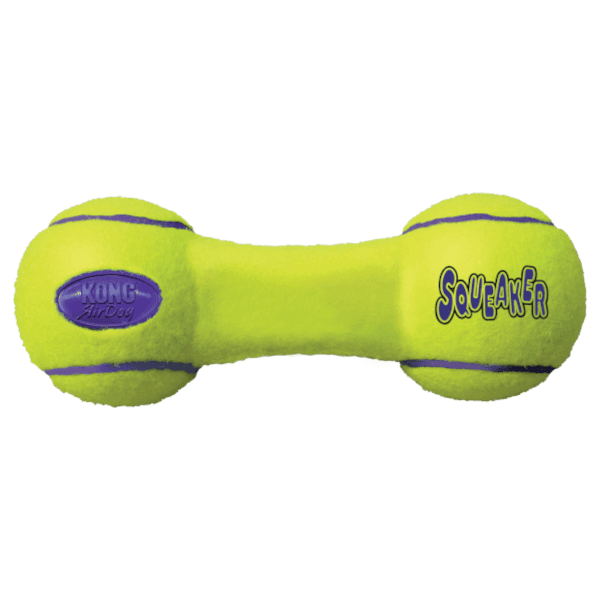 KONG AirDog® Squeaker Dumbbell combines two classic dog toys -the tennis ball and the squeaker - to create the perfect fetch toy. The non-abrasive, high-quality material will not wear down dogs’ teeth. The non-abrasive, high-quality material will not wear down dogs’ teeth. Find your dog’s favorite AirDog® shape and let the games begin.