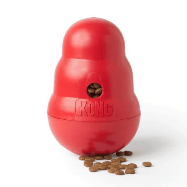 The KONG-shaped Wobbler is an action-packed treat and food dispensing toy. It sits upright until pushed by a dog’s paw or nose and then periodically dispenses tasty rewards as it wobbles, spins and rolls. It sits upright until pushed by a dog’s paw or nose and then periodically dispenses tasty rewards as it wobbles, spins and rolls. The unpredictable movement keeps the toy challenging, even for seasoned Wobbler users. The Wobbler can also be used as an alternative to a dog bowl to help slow and extend mealtime while providing exercise for your dog. Unscrews for easy filling and cleaning. Covered by KONG Satisfaction Guarantee.