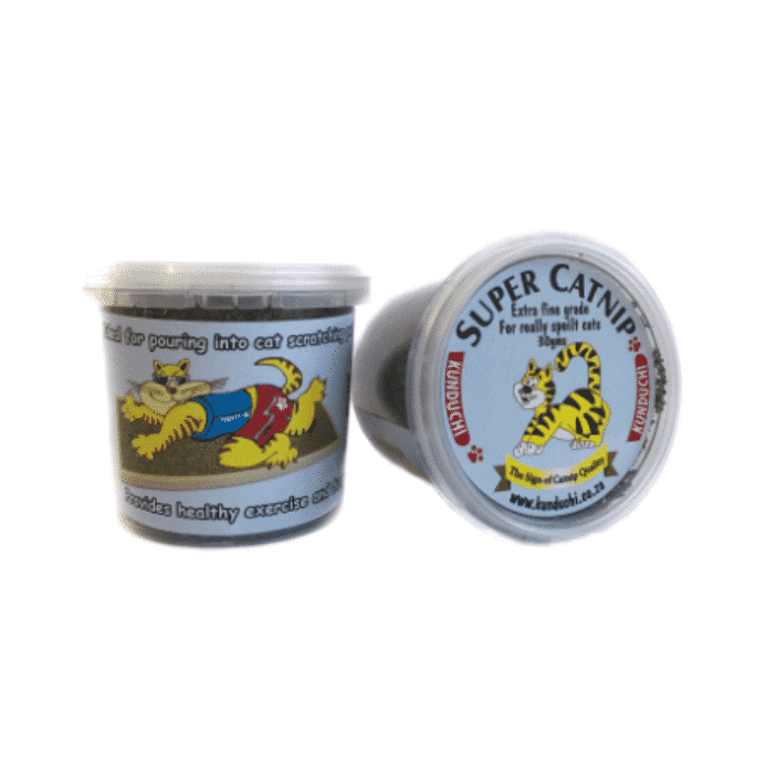 Super Catnip Powder (packed in tubs for freshness) is a finer grade of catnip. Super Catnip Powder is ideal for rubbing into cat scratching boards, or simply spread it on the floor for your cats enjoyment.