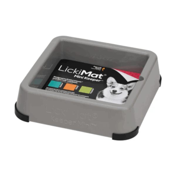 The LickiMat® Mini Keeper™ perfectly fits the LickiMat Mini Soother, Mini Buddy and Mini Playdate feed mats. It discourages chewing and keeps your floors clean!