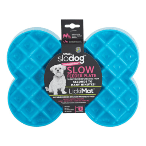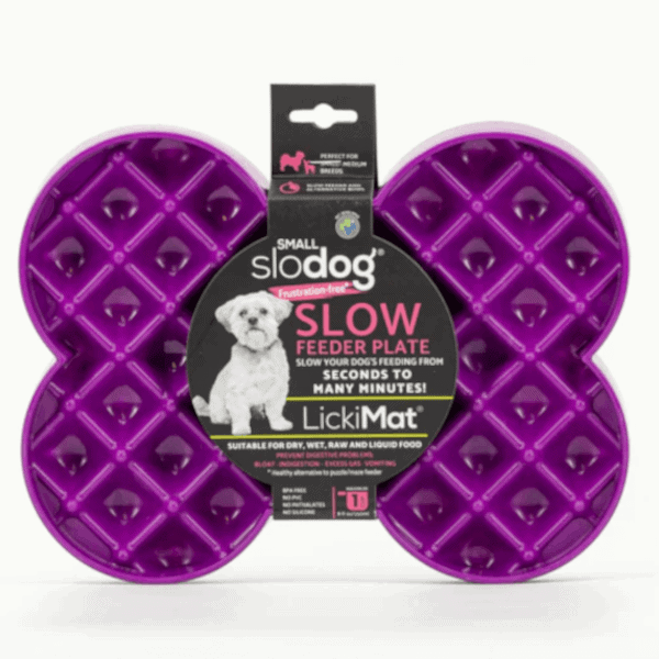 The LickiMat® Slodog Small™ slowfeeder is easy to fill and with its non-skid base, slows feeding from seconds to many minutes. No more gulping, just small bites.