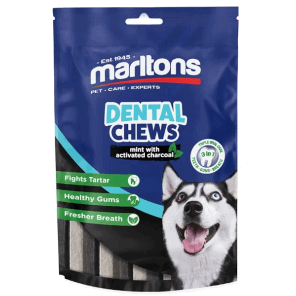 Optimise your dog’s dental care with Marltons Mint and Activated Charcoal Dental Chews – the convenient and tasty way to maintain oral health.