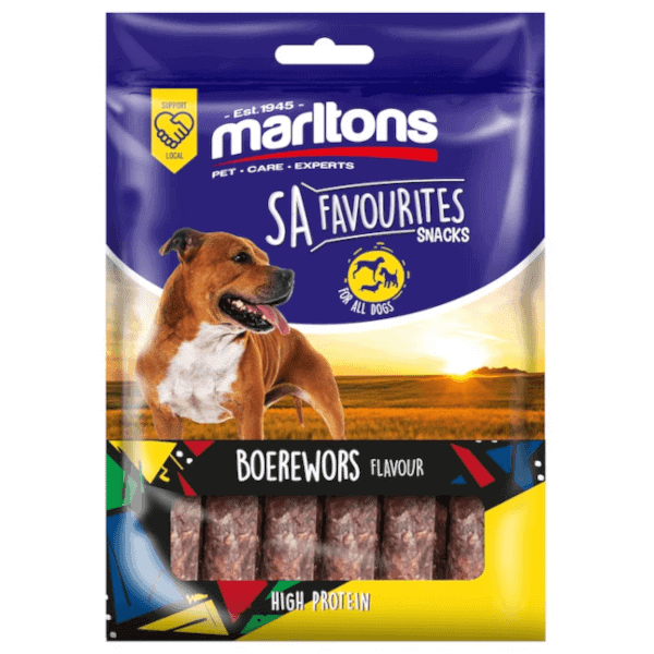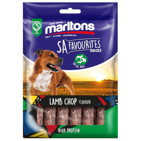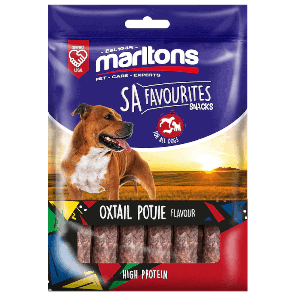 Add variety and extra nutrients to your dog's diet by treating them to a taste of home. Marltons SA Favourites Semi-moist Snacks are offered in three local South African flavours, Boerewors, Oxtail Potjie and Lamb Chop. Homegrown with real meat and produced in the Karoo. For all dogs and all ages. Add variety and extra nutrients to your dog's diet by treating them to a taste of home. Made in the Karoo