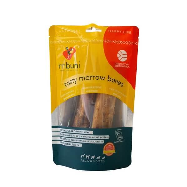 Marrow bones that are dried to perfection. These boredom busters will keep your furry friend busy for a long time. We kept the original ostrich marrow inside for the ultimate flavor enjoyment.