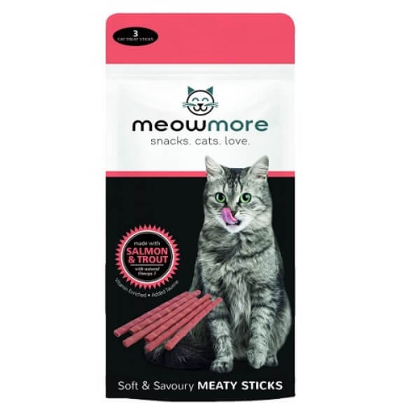 Meow More Salmon & Trout Cat Treats are a soft and savoury stick made with real meat for a taste that your cats will love.