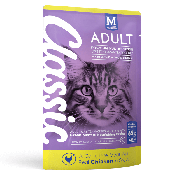 Classic Wet Food provides a complete, balanced and enticingly delicious meal, or a tasty complement to your cat’s daily dry food diet. Serve on top, mixed in or on its own – however they like it! Choose between Tender Chicken in Gravy and Atlantic Salmon in Jelly for your feline companion. Classic Wet Food provides a complete, balanced and enticingly delicious meal, or a tasty complement to your cat’s daily dry food diet. Serve on top, mixed in or on its own – however they like it!