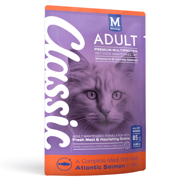 Choose between Tender Chicken in Gravy and Atlantic Salmon in Jelly for your feline companion.