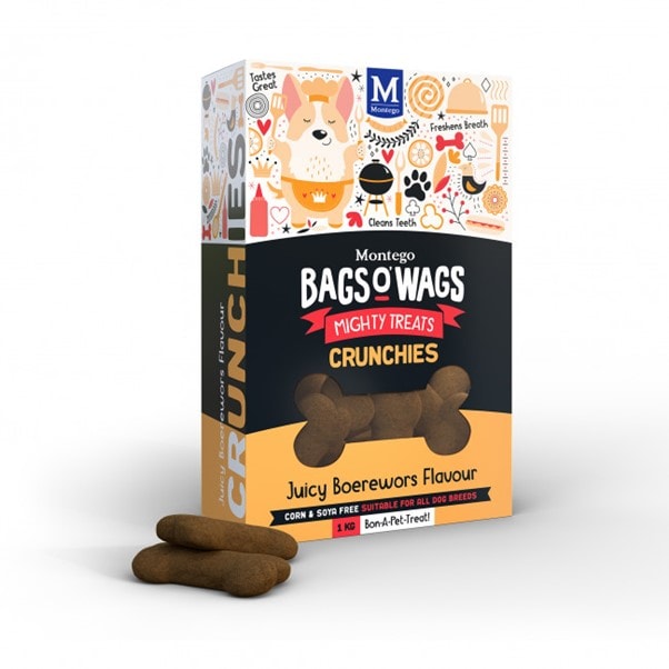 Wagtastically delicious and pack with nutrition , BAGS O' WAGS Boerewors Crunchies Dog Biscuits are the perfect treat for deserving dogs! These yummy goodies are made using only the finest ingredients and prepared to perfection to satisfy even the fussiest of pups.The Bags O’ Wags range is a healthy reward for good behaviour. a tempting incentive when training or a between meal-snack. Ideal for daily use, Bags O’ Wags treats makes for the ultimate addition to any Montego diet.
