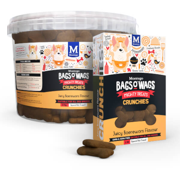 Wagtastically delicious and pack with nutrition , BAGS O' WAGS Boerewors Crunchies Dog Biscuits are the perfect treat for deserving dogs! These yummy goodies are made using only the finest ingredients and prepared to perfection to satisfy even the fussiest of pups.The Bags O’ Wags range is a healthy reward for good behaviour. a tempting incentive when training or a between meal-snack. Ideal for daily use, Bags O’ Wags treats makes for the ultimate addition to any Montego diet.