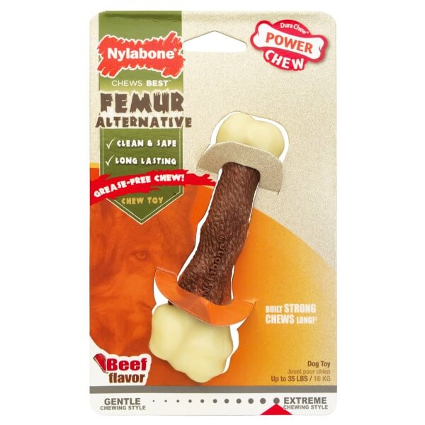Inspired by nature, this long-lasting, splinter-free chew toy is cleaner and safer than real animal parts. It features authentic beef flavour throughout that dogs love, and it entices powerful chewers with its real bone shape. Our femur dog bone alternative is made with durable nylon that stands up to aggressive chewers and promotes healthy chewing habits. Plus, the textured surface helps clean teeth and control plaque and tartar build-up as dogs chew. With no mess, mould, stains, or grease, this dog chew bone is the perfect alternative to real bones. Ready to satisfy your furry friend's natural urge to chew? Go ahead and give them a Nylabone chew toy!