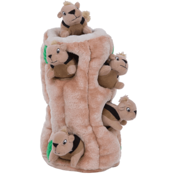 - Hide & squeak fun: fill the tree trunk with 6 stuffed squeaky squirrels and watch as your dog uses their natural hunting instincts to find and pull them out one by one.