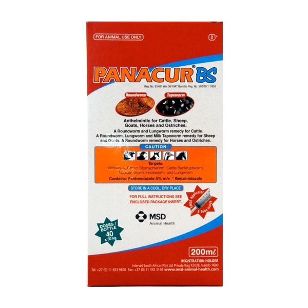 Panacur BS is an anthelmintic for cattle, sheep, goats, horses and ostrich which also treats roundworm, lungworm and milk tapeworm.