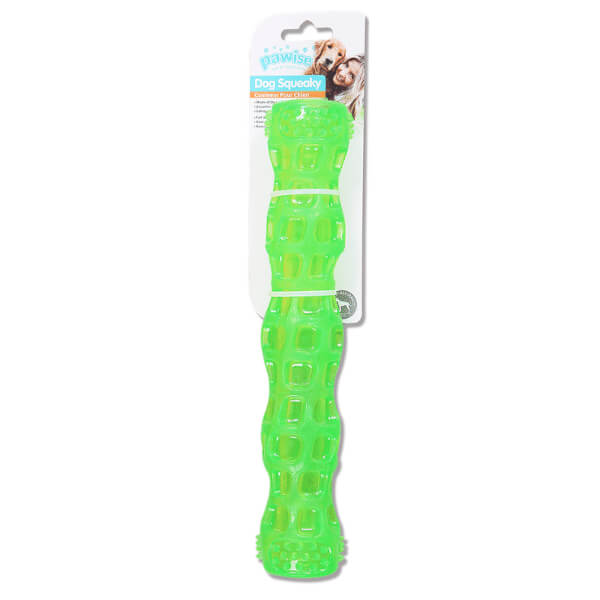 Great for both indoor and outdoor play, the Pawise Squeaky Stick is the ultimate toss and fetch toy. Made from durable and non-toxic Thermo Plastic Rubber, it is designed to withstand the roughest and toughest play. The Squeaky Stick’s surface features a variety of indentations and raised nubs that provide grip while creating an interesting texture for dogs to chew. They also provide a gentle gum massage to promote oral health. For added stimulation, an intense and irresistible safety squeaker is nestled inside.
