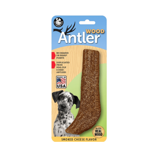 Pet Qwerks® Smoked Cheese Wood Antlers are designed for moderate to gentle chewers or dogs who may be in their senior years. Inspired by real elk and deer antlers, these Wood Antler Chew options provide a safe alternative to a natural favourite by eliminating the risk of sharp bone fragments or broken teeth.