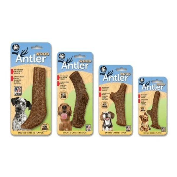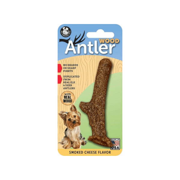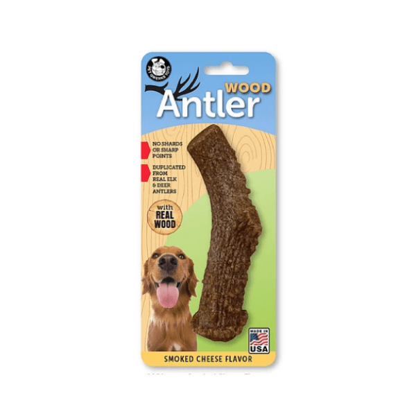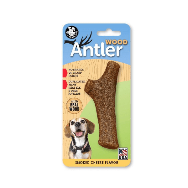 Pet Qwerks Wood Antler Smoked Cheese real wood dog chew toy