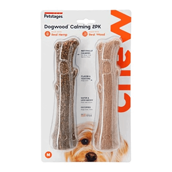 - Durable alternative wood chew toy: Petstages Original and Calming Dogwood chew sticks are made in the U.S.A. from a blend of natural wood fiber and safer synthetic materials to mimic the texture and taste of real wood that your dog will love. This two pack comes with one hemp flavour and one original wood flavour Dogwood.