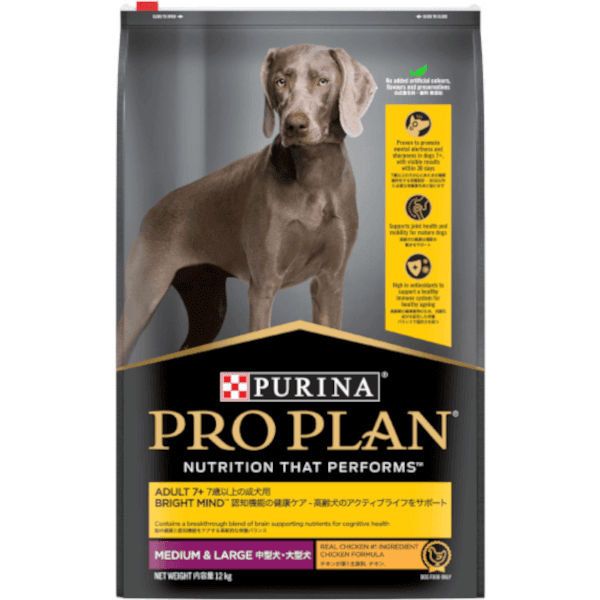 PRO PLAN Adult 7+ Medium Large Bright Mind Dry Dog Food is made with high quality chicken, delivered frozen to lock in nutrients, then perfectly cooked for delicious taste. Bright Mind is a breakthrough innovation in canine nutrition which combines MCT oils and key nutrients for dogs 7+ to support healthy ageing.