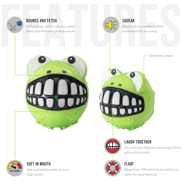 Have Grinz fun with a twist with the ROGZ Grinz Fetch Frog Toy. This playful, frog-shaped fetch toy is designed to give your dog endless fun. With a toothy smile and goofy design, this toy will keep your dog entertained and engaged through bouncing, fetching, and hours of squeaky fun!