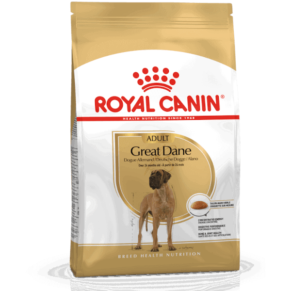 Please Note: This item is on backorder only and may take 5-7 working days to be dispatched Widely recognised as the largest dog breed in the world, the Great Dane combines pride, power and poise into one very big package! Suitable for Great Danes aged 24 months old and over, ROYAL CANIN® Great Dane Adult is specially formulated with all the nutritional needs of your adult dog in mind. ROYAL CANIN® Great Dane Adult contributes to supporting digestive health. This is thanks to the inclusion of highly digestible L.I.P. proteins and a selection of specific fibres that help to limit intestinal fermentation and support a good balance of intestinal flora. With its imposing stature and very long growth period, the Great Dane demands a great deal from its joints. ROYAL CANIN® Great Dane Adult contains an adapted amount of calcium, phosphorus and other specific nutrients (such as EPA & DHA) to help support healthy joints and strong bones. What's more, with a body that typically consists of 80% muscle mass, the Great Dane has energy needs that are (on average) 50% higher than other dogs in its class. That's why ROYAL CANIN® Great Dane Adult contains an adequate energy content to meet the high energy needs of the Great Dane without overloading its stomach.