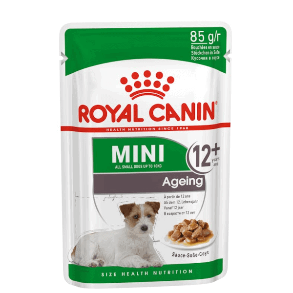 Suitable for small dogs over 12 years of age that weigh up to 10kg, ROYAL CANIN® Mini Ageing 12+ in Gravy is specially formulated with all the nutritional needs of your mini dog in mind. ROYAL CANIN® Mini Ageing 12+ in Gravy contains an exclusive complex of antioxidants.