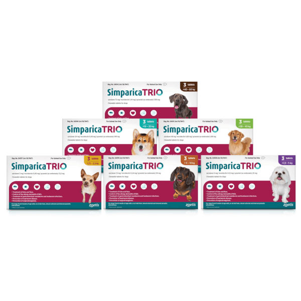 Monthly Simparica Trio prevents heartworm disease, kills adult fleas and is indicated for the treatment and prevention of flea infestations, the treatment and control of tick infestations, and the treatment and control of roundworm and hookworm infections in dogs and puppies 8 weeks of age and older, and weighing 1.3kg or greater.