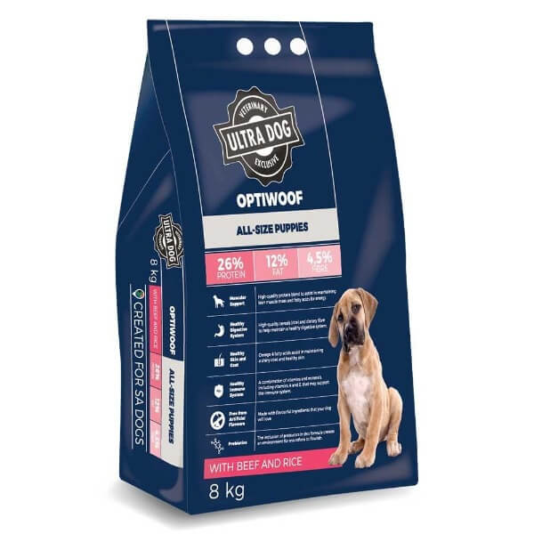 Ultra Pet Optiwoof understands that your puppy’s good health is reflected in the way they look, feel and develop – it’s in their strong muscles, high energy levels, shiny coat and healthy skin. Ultra Pet Optiwoof dry puppy food has been developed by our resident veterinarian and animal nutritionist. It is suitable for all puppy breeds and will deliver the required levels of protein and fat to help your puppy develop into a healthy, active adult dog. Our new range has been formulated with the inclusion of prebiotics, a plant-based fibre that helps to improve the health of your dog’s intestinal and digestive systems.