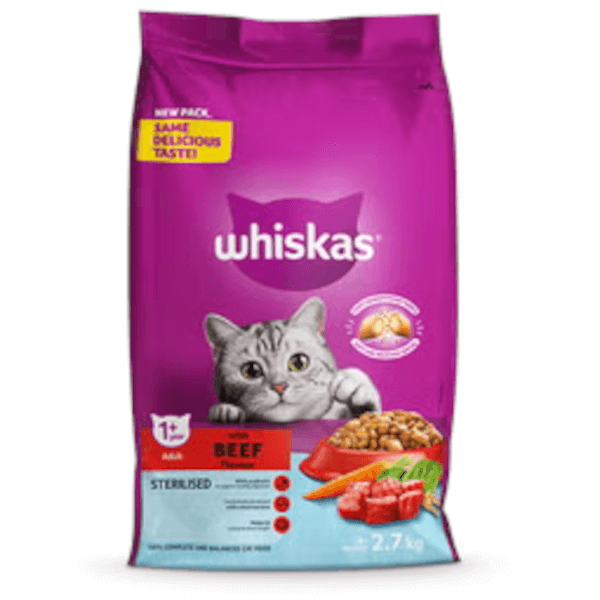 Our tasty WHISKAS® Sterile Adult Beef kibbles are carefully prepared to give your feline friend everything they need to keep them purring. Our sterile recipe is optimised to provide fewer calories per serving*, ideal for neutered cats. Made with high quality ingredients sourced only from trusted suppliers, our delicious recipe provides the purrfect balance of vitamins and minerals to keep them happy, healthy & running to the bowl every mealtime.